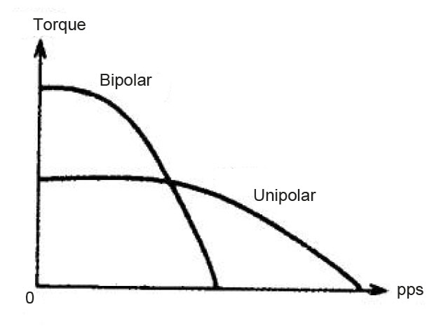 図 4 は、ユニポーラ ステッピング モーターとバイポーラ ステッピング モーターの特性曲線を示しています。どちらも同じ定電流駆動モードを採用しています。 一般に、低速および高トルク負荷のアプリケーションではバイポーラ ドライブが使用され、高速ドライブのアプリケーションではユニポーラ ドライブが使用されます。